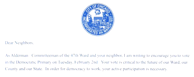 * In the 47th Ward, Ald. Gene Schulter put the official City of Chicago Seal on his election day mailer. That would not be legal. Click on the pic for the full thing…