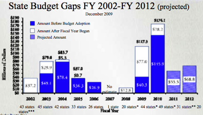 I think that may be too optimistic. Our own state’s deficit is projected at $13 billion in Fiscal Year 2011, which would be about a quarter of the NCSL’s projected all-states deficit of $55.5 billion - although only 30 states provided data for the year in question, as compared to 35 for the current FY.