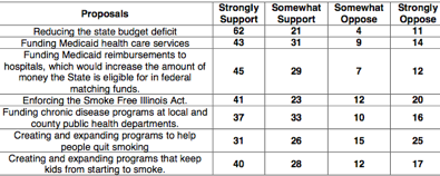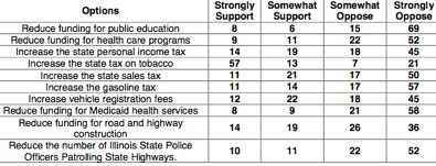 * Next question: “Now, as you may know, Illinois is facing a significant budget deficit, estimated to be over thirteen billion dollars. I’m going to read several options that have been proposed to help address the budget deficit. After each one that I read, please tell me if you would Support or Oppose that option to help reduce the state’s budget deficit…
