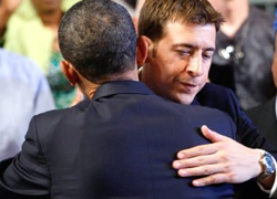Obama mentioned Giannoulias’ name during his remarks. Later, the president gave a departing good-luck hug to Giannoulias, his former basketball playing buddy. Obama has been close with Giannoulias, providing a vital endorsement in getting Giannoulias elected state treasurer four years ago.
