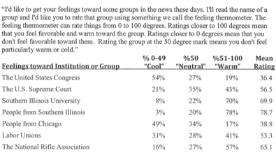 I find it hillarious that downstate likes people from Chicago more or less that same as members of Congress. More people had warm views of Congress than Chicagoans.