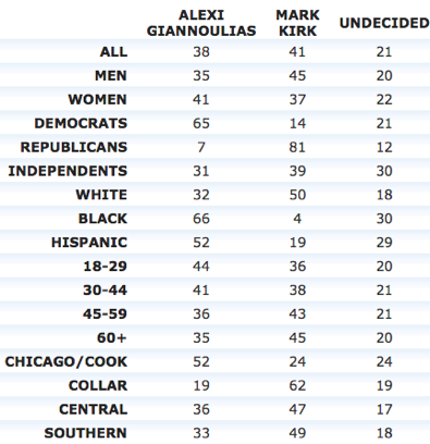 Mark Kirk (R) 41 (36) [46, 37, 41, 41]