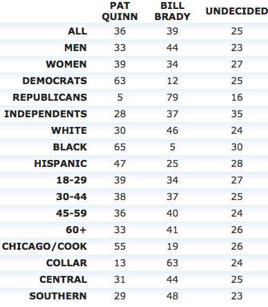 Bill Brady (R) 39 (35) [45, 43, 45, 47]Pat Quinn (D) 35