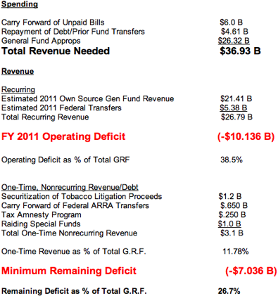 After all revenue sources, recurring and non-recurring are included, Illinois’s 2011 budget deficit is 26.7% of its General Revenue Fund. Consider that over 90% of General Funds are spent on four areas: Education; Healthcare; Human Services; and Public Safety.