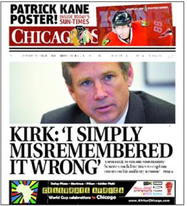 * If Kirk was hoping to bury this story by scheduling the editorial board appearances during the first day of the Blagojevich trial, he failed. The Tribune and the Sun-Times both put him on the front page…