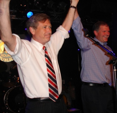 Representative Mark Kirk and Senator Bill Brady celebrate after Kirk single handedly defeats the Taliban in Afghanistan using Brady’s latest invention, the Puppy Gun (patent pending).