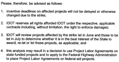 Not only could IDOT have cost the contractors a fortune in loss of their incentive bonuses, but they were in danger, via a PLA, of actually being replaced by contractors who would sign a union deal.