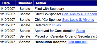 In the Senate, for whatever reason, they don’t put the original sponsor’s name in the bill actions section. Let’s look at a Senate resolution from 2007 which made Deb Shipley the Secretary of the Senate. Here is the section which lists sponsors…
