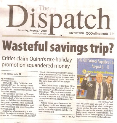 “Unlike Republican Gubernatorial Candidate Bill Brady, Governor Quinn failed to do so. While Bill Brady reaffirmed the need by the federal government to fulfill its obligation to control our borders and to promote legal immigration, Pat Quinn buried his head in the sand. Why? Because, Governor Quinn was rushing to board his taxpayer-funded state plane to campaign in support of a sales tax holiday he’s trumpeting while proposing the largest tax increase in Illinois’ history – all at the same time.” [Emphasis added]
