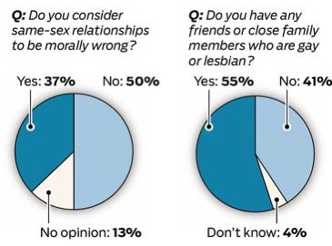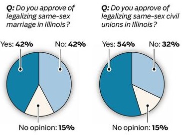 The overall opinion on legalizing same-sex marriage, when city respondents are factored in, is split: 42 percent oppose it, 42 percent support it and 15 percent have no opinion. The Market Shares Corp. telephone poll of 800 male and female heads of household from the six-county Chicago area has a margin of error of plus or minus 3.5 percentage points.