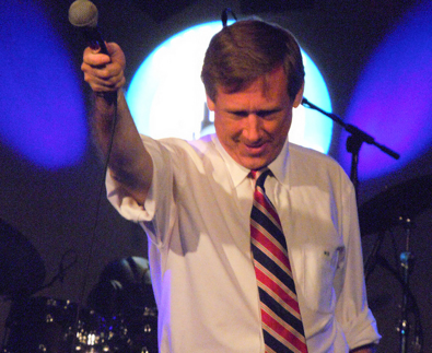 Mark Kirk listens to applause after finishing off his Karaoke version of “I Will Survive.”