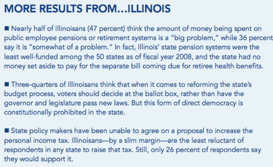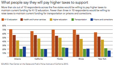 On the revenue side of the ledger, 70 percent of Illinoisans, like respondents in the other four states surveyed, say they would be willing to pay more in taxes to maintain the current level of support for elementary and secondary education, and nearly six in 10 say the same for health and human services.