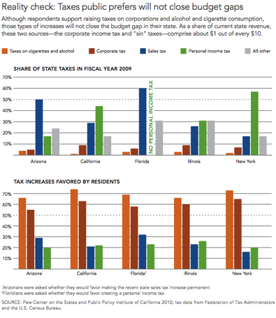 But when given a choice of several options for raising new money for the state, respondents continue to shy away from broad-based tax increases. Sixty-six percent say they favor raising taxes on alcohol and cigarettes and 54 percent favor expanding gambling, while 60 percent favor raising corporate taxes. But these are not major sources of revenue for the state, so even if they were increased, they would not bridge the gap. And there are other obstacles to these options: For instance, increasing income taxes on businesses is complicated by restrictions in the state constitution.