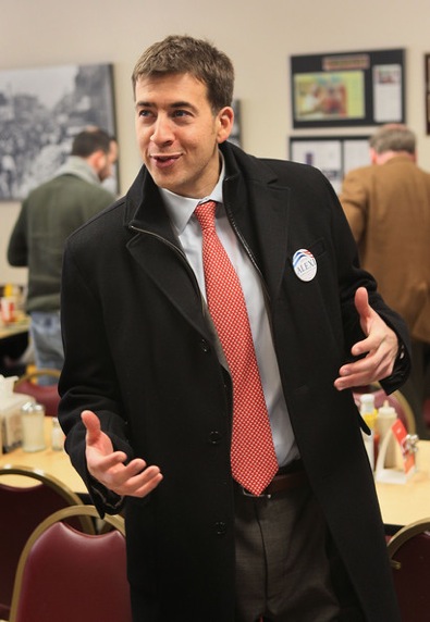 Senate candidate Alexi Giannoulias asks a voter if he can borrow a napkin after he got grease on his hands at a famous south side deli.