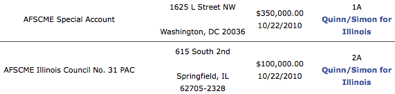 * After the controversy over Gov. Pat Quinn’s no-layoff agreement with AFSCME around the time that the union endorsed his candidacy, it was probably no surprise that the state’s largest public employee union had given the governor no contributions. But late Friday night, the governor’s campaign disclosed $450,000 from two AFSCME contributions…