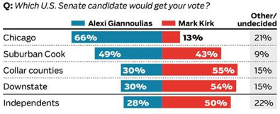 Kirk holds a strong 15 percentage-point advantage among men, and Giannoulias has an 8 percentage-point edge among women across the state. But the two men each have the support of 43 percent of a key voting demographic: white suburban women who tend to be social moderates.