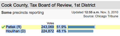 Frank has it right. Houlihan won initially because people thought they were voting for the Assessor Houlihan. Conversely, they voted against him this time because of disenchantment with Assessor Houlihan. Add the big Repub wave in the northwest suburbs, Bye, bye Houlihan. He was kind of a stuffed shirt also who always looked like he was in outer space. Not the politician his late father was.