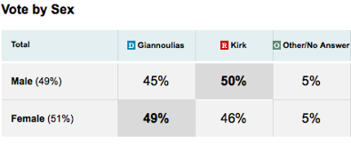Look at the difference in the female vote between the two candidates and the difference in how both genders voted for third party candidates. Brady was hurt both ways.