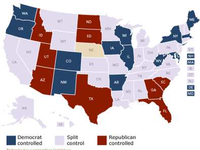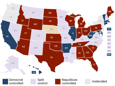 At least 30 states will be governed by a single-party when new lawmakers and governors are sworn in early next year. Last week’s election gave Republicans control of the legislature and the governor’s office in 20 states, up from nine. Democrats, who controlled 15 states, will see that number shrink to 10.