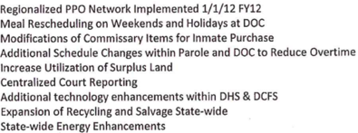 – Other efficiencies, including reducing the use of paper, expanding salvage and recycling programs at state prisons, improving operations of the state’s Corrections Industries, making correctional facilities more energy-efficient and changing how parole agents travel.