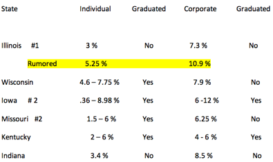 Note that corporate tax rate. Pretty much all the media coverage has claimed the rate would rise to 8.4 percent. Not true. Corporations also pay a Personal Property Replacement Tax of 2.5 percent of income. That means the total corporate rate will rise to 10.9 percent. More from the Taxpayers Federation…