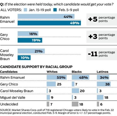 ==The Tribune’s numbers and the internal polling of the Emanuel, Chico and Braun campaigns look similar. So can we discount the ABC7 poll numbers?==