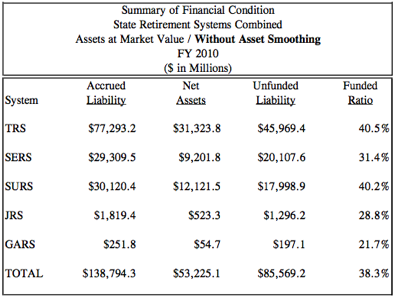 * But the Pew report is actually way off. According to the Commission on Governmental Forecasting and Accountability, total unfunded liability was $78 billion in FY 2009 (way above Pew’s $62 billion), and almost $86 billion by FY 2010.
