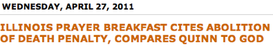 Absolutely nothing in the SJ-R story has anything close to such a reference about Quinn being compared to God. It’s about the governor’s annual prayer breakfast, for crying out loud…