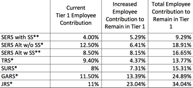 * Click here for Leader Cross’ fact sheet. Click here to read the proposal itself. These are the current employee contribution levels, proposed Tier 1 increases and final proposed contribution rates. Click the pic for a larger image and alternative system contribution rates…
