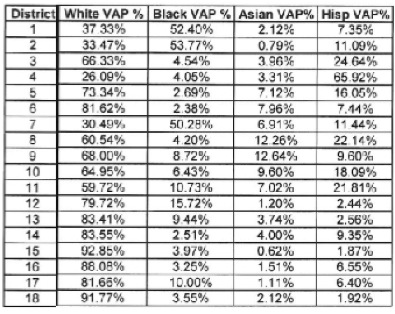 * You can find the newly revised maps by clicking here. And here are the voting age population breakdowns by district…