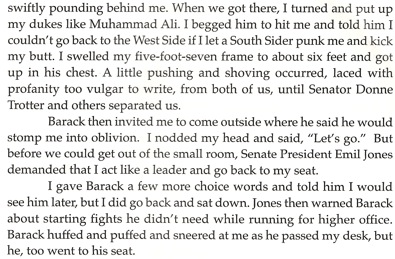 Even President Barack Obama was involved in shoving match with another legislator, former Sen. Rickey Hendon (D-Chicago). That altercation came during former Gov. George Ryan’s stint in office and occurred in the rear of the Senate chamber out of public view, Hendon wrote.