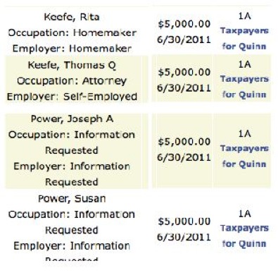 * Meanwhile, Gov. Quinn appears to be getting around the state’s new individual fundraising cap by soliciting contributions from husbands and wives at the same time. For instance…
