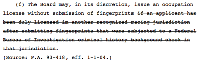 That’s absolutely not true. The Racing Board has always had discretion to waive fingerprint requirements. The new proposal deletes the requirement that waivers could be given only to applicants who’ve undergone FBI background checks for licensure. Sen. Terry Link explained the proposal this week…