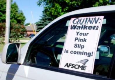 An AFCSCME union poster with Wisconsin Gov. Scott Walker’s name crossed out and Illinois Gov. Pat Quinn’s penciled in sits in a vehicle window Thursday outside the Jack Mabley Developmental Center in Dixon. The poster is an apparent protest of Quinn’s announcement earlier in the day that the facility was one of seven he proposed to close due to Illinois’ budget deficit.