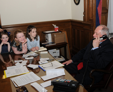 “Principal Jones, this is Pat Quinn, Governor of our great state, … Illinois … yes, hello … I was calling to let you know, Suzie, and Rachel, and Sarah are not going to be in school today … they are going to learn about government today, and help me with my job. ….. Yes … Governor Quinn … YES ….they are going to do their civic duty and pitch in … Well, Suzie is going to be Governor for a day …. no, …. no … for a DAY … not the rest of my term ..”