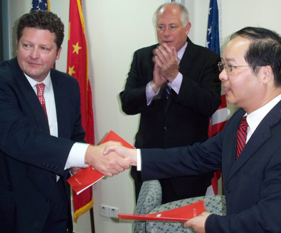 Officials shake hands after signing an agreement pledging cooperation on a number of issues vital to both the State of Illinois and the People’s Republic of China.