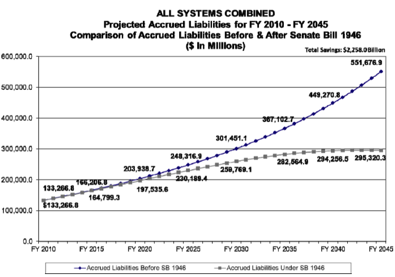 • Under P.A. 96-0889 [the pension reform bill for new hires], State contribution for fiscal years 2010 – 2045 will be reduced by $71.1 billion as a result of a second tier of benefits for new hires.