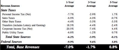 * The ferocity of the international collapse obviously took Madigan and others by surprise. By the time they looked up from their war, the budget had gone to heck and the piper had to be paid. Here’s revenue growth ending FY 2010…