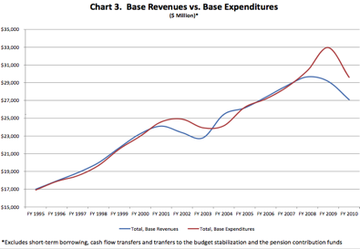 For instance, here are base state revenues (blue) vs. base spending (red) from FY 1995 through FY 2010…