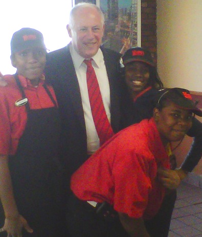 Shortly before receiving his free “Where’s the beef?” t-shirt (he had clipped a coupon), Governor Pat Quinn posed for this picture with Wendy’s employees and half-joked, “Wendy’s and I both know full well that you can’t fake real.”