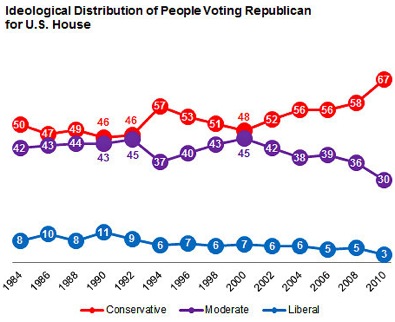 The chart, culled from exit poll data, shows the ideological disposition of those people who voted Republican for the House of Representatives in the elections of 1984 through 2010. Until fairly recently, about half of the people who voted Republican for Congress (not all of whom are registered Republicans) identified themselves as conservative, and the other half as moderate or, less commonly, liberal. But lately the ratio has been skewing: in [2010’s] elections, 67 percent of those who voted Republican said they were conservative, up from 58 percent two years earlier and 48 percent ten years ago.