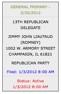 * Champaign News-Gazette political columnist Tom Kacich (not online, so no link) reported today that James Liautaud, the CEO of the Jimmy John’s chain, is running as a Mitt Romney convention delegate, in Champaign.