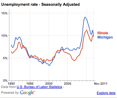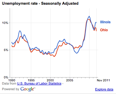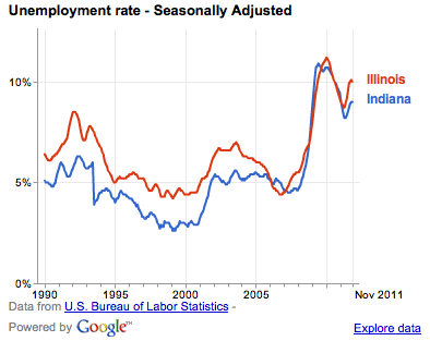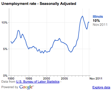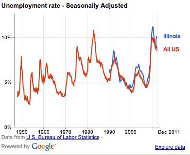 * To make a long story slightly shorter, I went through every state last night and compared them to Illinois. Nowhere did I see the same sort of upward unemployment rate spike in 2011 that we saw in Illinois.