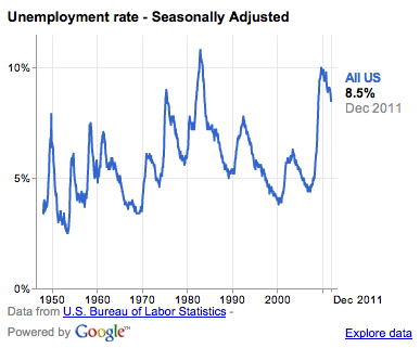 * Google has a great analytical tool that you can use to compare unemployment rates over the years. I’ve done screen caps to make them easier to load. Here is the US rate since 1950, for instance…