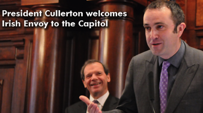President Cullerton smiles as the envoy shares his story of how he was able to talk Governor Quinn into giving up his purple tie.