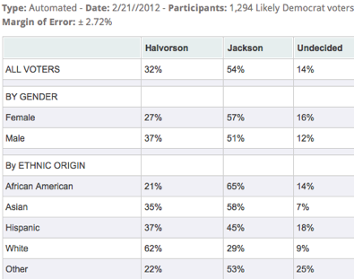 If you break it out by precinct, even then, Halverson would have to run numermous 70-30 precincts in such a clip to offset the strong African-American precincts JJJ will run at that clip or better (more like 80-20) and then go nearly 60-40 in the rest of her precincts.