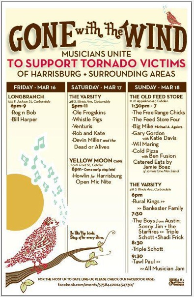 * Several southern Illinois musicians have put together a huge benefit weekend in Carbondale for the Harrisburg tornado victims. “Gone With the Wind” starts tonight and runs through Sunday. The event’s Facebook page is here. Click the pic for a larger version of the program…