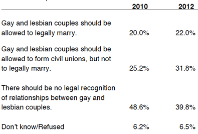 * There’s also been a statistically significant shift on gay marriage/civil unions since the Institute’s last poll in 2010…