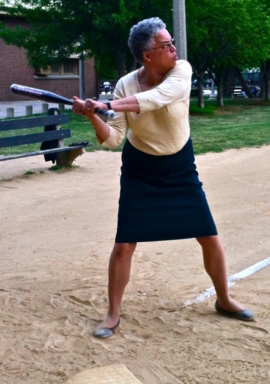 Cook County Board President Toni Preckwinkle attempts to hit a home run by scaring the ball out of the park.