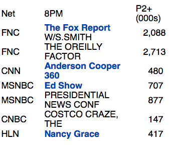 Rich left out that the cable news audience is geezeriffic. Click the link and notice how the 25-54 demo is even worse for cable news. The average age is somewhere around ancient and fossilized.